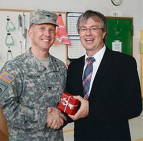 Vereinsvorsitzender Georg Feuerer verabschiedet COL Zellmer (links) und begrüßt den neuen Commander COL Rector (rechts).