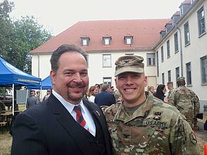 Gerhard Rankl von Amerika in Augsburg e.V. im Gespräch mit COL Holden beim Empfang im Hauptquartier der 66th Military Intelligence Brigade.