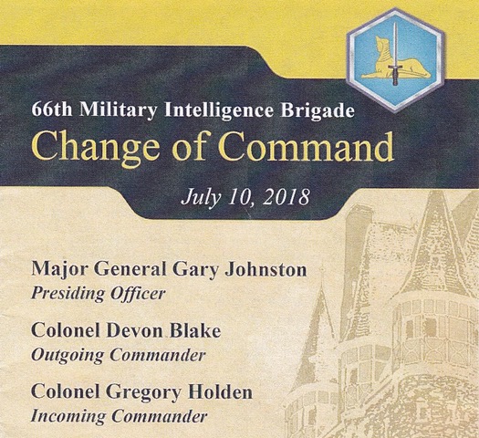 Am 10. Juli 2018 übergab Colonel Devon Blake ihr Kommando an den neuen Kommandeur Colonel Gregory L. Holden. Dieser zeigte sich beim anschließenden Empfang vor dem Hauptquartier der 66th MI im persönlichen Gespräch mit Vereinsmitglied Gerhard Rankl sehr aufgeschlossen, die langjährigen Beziehungen zwischen der 66th MI BDE und Amerika in Augsburg e.V. zu erhalten.