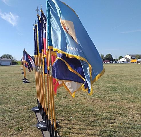 Links: Herzliche Verabschiedung zwischen dem Vorsitzenden Georg Feuerer und COL Devon Blake. Rechts die Flaggen der US-Bundesstaaten auf Ständern mit jeweils zehn Stück.