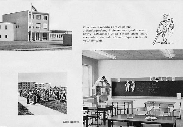 With the beginning of the construction of Centerville Housing Area - south of today’s Bürgermeister-Ackermann-Straße (B.-A. Street) in 1951 - a Dependent Elementary School (grade school) with two Pre-School Kindergartens was finished in 1953. The school, Bldg 528 - designed by the German architect Paul Gerne - featured each and every convenience of the American culture, especially grand premises. Already in 1955, an annex in the western area had to be constructed. In 1967, temporary buildings were erected, which were replaced in 1977 by a vast second Elementary School, Bldg 581, in the Cramerton Housing Area. This was due to the increasing number of enlisted and professional soldiers with their dependents, after the American draft system had been terminated in 1973. During the 1980s, the most intensive school years, a total of 1,500 kids visited at the Elementary Schools. American elementary school kids behaved very disciplined after the end of their school day: they marched quietly two abreast from their classrooms to their respective school busses.