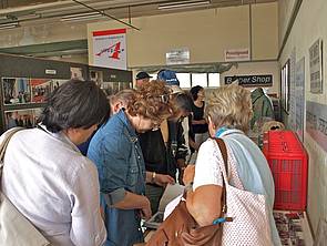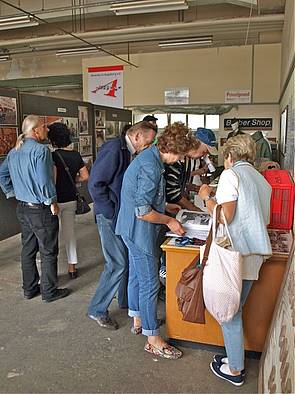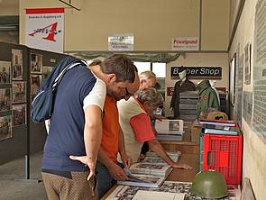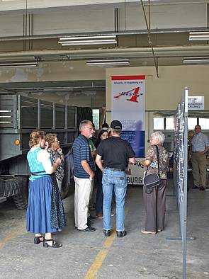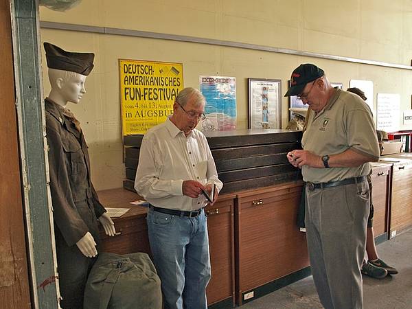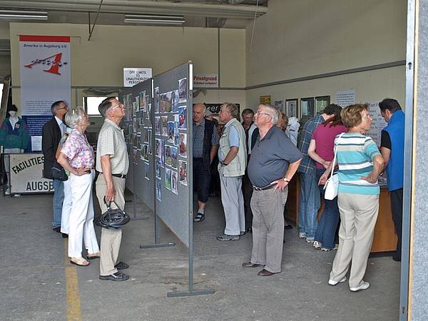 Bilder oben: Ganztägig reges Interesse an der Geschichtsdokumentation des Vereins. Die Besucher kamen aus allen denkbaren Schichten der US-amerikanischen Zeit, seien es ehemalige Zivilbeschäftigte, Kasernennachbarn, Personen deren Eltern US-Beziehungen hatten, Dienstleister der US-Armee, geschäftliche Nutznießer, Insider aus Kultur und Gesellschaft, administrativ tätig gewesene Personen, oder aber auch Vatersuchende. Nicht zuletzt ist ein Interesse der jungen Generation an der für sie vorangegangenen Zeit sichtbar, indem Schüler und Studenten das amerikanische Thema zu geschichtlichen Arbeiten heranziehen. Aber auch in Augsburg verbliebene Amerikaner ließen sich sehen.