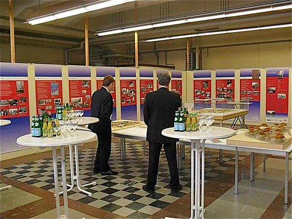 Prof. Philipp Gassert (Uni Augsburg) und Vereinsvorstand Georg Feuerer bei der Besichtigung der Universitätsausstellung im Building 116.