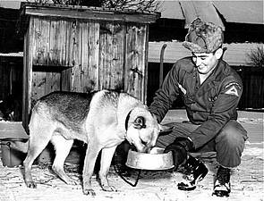 The dogs had to take three months of “basic training” in Augsburg. They were required to re-take the course every time they got a new handler. Dog and handler were always a close unit. Top training included extra tricks like playing dead dog and answering sick call by limping around on three legs. The platoon fed one pound of horsemeat per meal and dog each day. The Scout Dog Platoon included one officer and twenty enlisted men, including platoon leader, platoon sergeant and veterinarian.