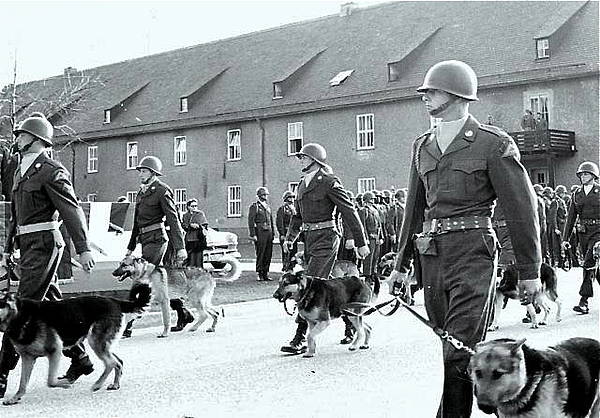 Stationed in Augsburg in the early years were, among others, the 5th Infantry Division, and later, until 1958, the legendary 11th Airborne Division. Besides the ubiquitous military vehicles and soldiers there was, at that time, also a small, inconspicuous unit that hardly appeared outside the kaserne. South of Bldg 121 resided the 35th Scout Dog Platoon. From 1954 thru 1957, there were 18 Shafer Hounds and their handlers, 2d Lt Thomas M. Vaught being in command 1956-1957, 511th Airborne, as part of the 7th U.S. Army.