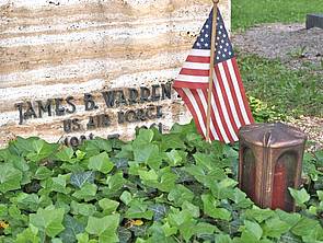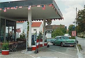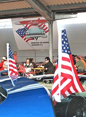 American Cafe an einer Ausfallstraße (links). Rechts: Eines von zahlreichen US-Gräbern in Augsburger Friedhöfen. Sie werden regelmäßig mit Stars and Stripes-Fähnchen geschmückt.
