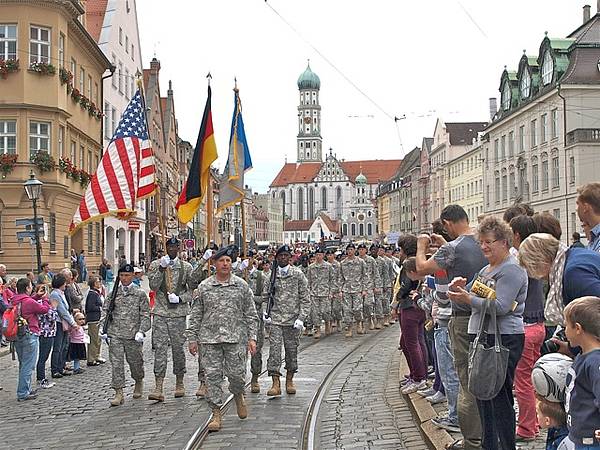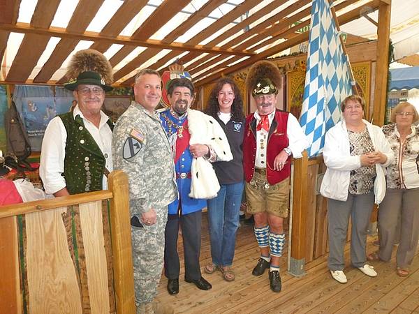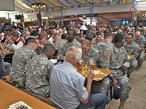 While there was unfortunately no U.S. participation last year, the 66th Military Intelligence Brigade from Wiesbaden once again accepted the invitation to this year´s Plärrer Fair Parade. Under the command of COL David W. Pendall, 48 soldiers - male and female - travelled to attend the traditional Augsburg autumn Plärrer Parade. On this late summer day, more than 20,000 onlookers stood along the route of the parade. They throughout showed their sympathy with the American guests, expressing remarkable reminiscence of the final U.S. unit in Augsburg. Amerika in Augsburg e.V. replenished the American group with historical vehicles. At the Bierzelt, not only the young Americans had a wonderful time, savoring a Maß (liter) beer and broiled chicken in the typical loud ambience of a Bavarian fair visit.