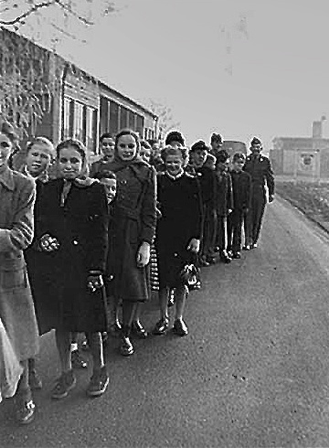 Pictures from Gablingen Kaserne: Top: Children’s Christmas 1949 (Photo: Private). Below: waiting kids from Gersthofen and Gablingen in front of Bldg 445 (Photo: John M. Holman). Bottom: Copy of a 1951 Schwäbische Landeszeitung article about a Christmas celebration at the Café Lohwald, Westheim (Note: Werner Lorenz).