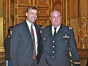 A historic gesture: The youngest attendee in the ’Goldener Saal’ (violinist Esther Steinmeier, 11 years old) and the oldest visitor (Wolfgang Döring, 91 years old) receive the 3rd Infantry Division’s coin out of the hands of the war veterans.