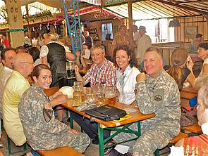 Am Biertisch: von rechts COL Pendall, Ehefrau Sandra und Vereinsvorsitzender Georg Feuerer. Linke Reihe von vorne: First Sergeant Lourdes Barragan, Heinz Strüber und verdeckt Gerhard Rankl, beide von Amerika in Augsburg e.V. Rechtes Bild: Traditionelle Partnerschaft auf Coin-Ebene.