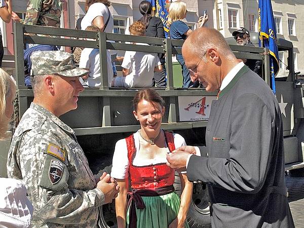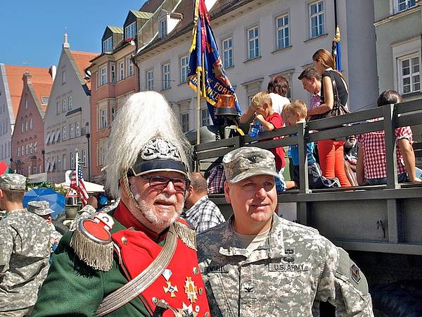 Martin Aigner vom Traditionsverband der (Leichten) Königl. Bayerischen Kavallerie (Cheveaulegers, Regiment „König“) und David W. Pendall von der 66th Military Intelligence Brigade in Erwartung des Umzugsbeginns.