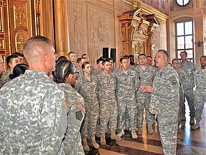 Links: COL Pendall erteilt Verhaltensinstruktionen und gibt Erläuterungen zum Besuch in Augsburg. Rechts: Antreten auf dem Rathausplatz. Im Hintergrund der Augustusbrunnen.