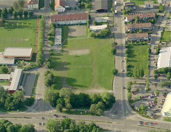 Der Volksfestplatz an der Bgm.-Ackermann-Straße (unten) aus der Luft. Links die ehemalige High School. (Bing Maps).