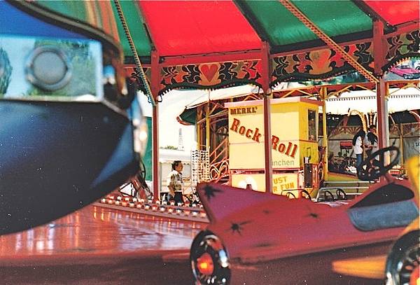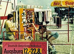 Knallig, bunt und schrill ging es zu. Die Musik war bayerisch, laut und auch country-amerikanisch; die Bierzeltstimmung am Abend kochend rhythmisch, ein Minikosmos, der dem Kalten Krieg und seinen Notwendigkeiten geschuldet war. Draußen konnte man sogar alte US-Straßenkreuzer mit dem Vorschlaghammer zertrümmern. Unverzichtbar waren die klassischen Schießbuden, Kettenkarussell, benzinbetriebene (abgasintensive) Go-Karts, Autoskooter und zeitgemäße Fahrgeschäfte. Es wurden auch Familientage mit ermäßigten Preisen angeboten. Als Besonderheit des Augsburger Volksfestplatzes galt die grüne Wiese, statt Schotter und Asphalt.