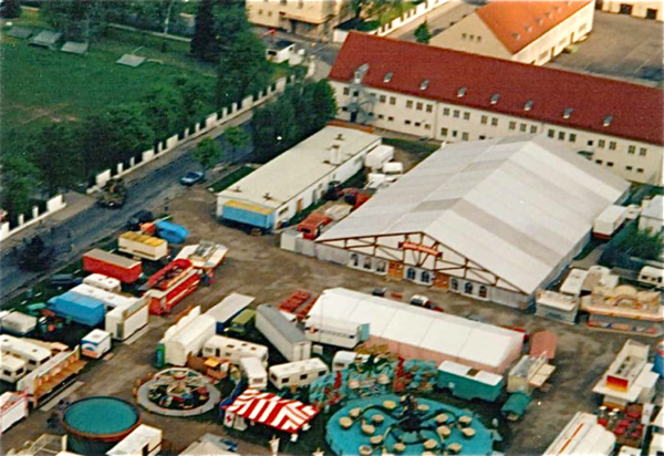 Einen zusätzlichen Augsburger „Plärrer“, den Ami-Plärrer, bildete das amerikanische Volksfest am Rande der Reese Kaserne. Hier eine Luftaufnahme um 1990 (via Bobbi Martinek).