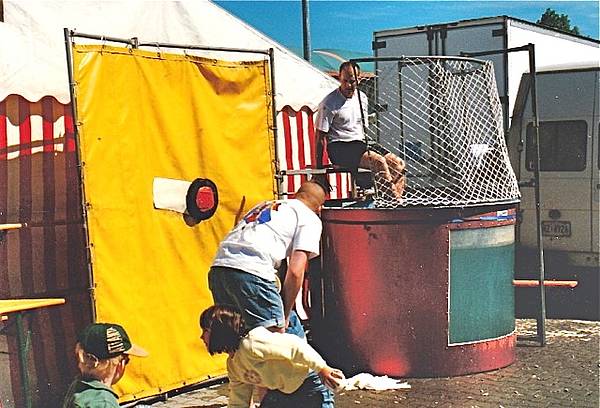 This “somehow different fair”, as it was called by later landlord Charly Held, offered whimsicalities that were never known at Augsburg’s ‘Plärrer’ fair. E.g. there was ‘Chuck-a-Luck’, a game with ice cubes, or ‘Dunk-Ball’, a crude GI joke, especially around Father’s Day in May, both fulfilling the schadenfreude of the spectators. A volunteering soldier, sitting on a hinged plank above a big tub full of water, would drop into the water when a customer hit a target with a ball and so dunked the loudly mocking GI. When the weather was nice, a pretty bikini-clad girl was sitting alternatively on said plank.