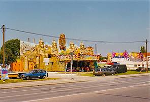 It was gaudy, colorful and brash. The music was loud, Bavarian or Country, the mood in the Bierzelt cooking rhythmic in the evening - a microcosm due to the Cold War and its necessities. Even old US cars that could be demolished with a sledgehammer were on the premises. Indispensable were the typical shooting galleries, the merry-go-round, the gasoline powered (air polluting) go-carts, the bumper cars, and the contemporary carousels. Even family afternoons with reduced prices were offered. A special feature of the Augsburg location was the lawn versus the usual gravel and/or asphaltic surfaces.