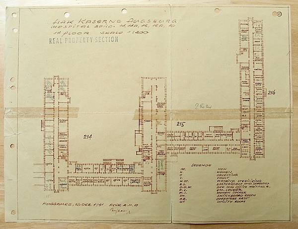 Die Behandlung der Patienten beschränkte sich auf zwei Gebäude (spätere Bldg 152 und 154, Anmerk.), die alle Krankenpfleger, klinische und ambulante Einrichtungen beherbergten. Alle Kantinen, zwei für militärisches und ziviles Personal, wurden in einem Gebäude (später Mess Hall Bldg 153, Anmerk.) untergebracht. Die Unterkünfte des militärisch-medizinischen Personals, die sich innerhalb der Kaserne befanden, waren angemessen und komfortabel. Während der Zeit in Augsburg bewohnten alle männlichen Offiziere beschlagnahmte Unterkünfte nahe der Einrichtung. (Genauere Recherchen ergaben, daß wahrscheinlich 6 Gebäude vom Hospital belegt bzw. geplant waren. Darunter alle der vier großen Unterkünfte am westlichen Kasernenrand, Anmerk.).
