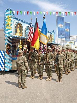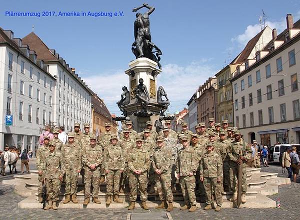 Forty men plus two women up front: In bright sunshine and under a typical white and blue Bavarian sky, numerous male and female soldiers of the 66th Military Intelligence Brigade from Wiesbaden offered - as every previous year - their greetings as the Fugger city’s last U.S. unit. Under the command of LTC Angela E. Reber, 24th MI Battalion, the delegation marched with astonishing expressive cadence singing to the Plärrer fair ground, the color guard ahead.