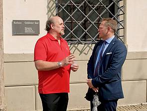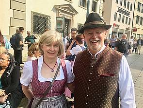 Links: Amerika unter sich. Vic McFadden und Konsul Stephen Ibelli (rechts) treffen sich vor dem Rathaus zu einem Begrüßungsgespräch. Rechts: ein amerikanisches Ehepaar, das Bayern schätzt.