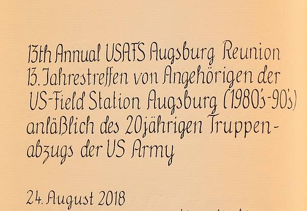 Am 24. August 2018 versammelten sich rund 100 aus den USA angereiste Reunion-Teilnehmer und zahlreiche Ehrengäste zu einem Rathausempfang der Stadt Augsburg. Auf Anregung des Vereins Amerika in Augsburg e.V. lud Oberbürgermeister Dr. Kurt Gribl die ehemaligen Militärangehörigen der Field Station Augsburg zu einer festlichen Begrüßung in den prachtvollen Goldenen Saal ein.