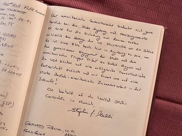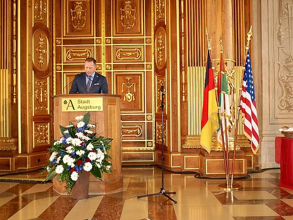 In seiner Ansprache ließ OB Dr. Kurt Gribl die Geschichte der amerikanischen Truppenpräsenz in Deutschland Revue passieren, bevor er ausführlich auf ihre Anwesenheit in Augsburg während der Zeit des Kalten Krieges einging und insbesondere die Bemühungen des Vereins zur Geschichtsbewahrung und völkerverbindenden Tätigkeit hervor hob. Ausdrücklich bat er alle Besucher, sich anschließend in das bereitliegende Gästebuch einzutragen.