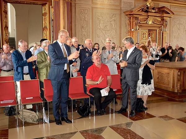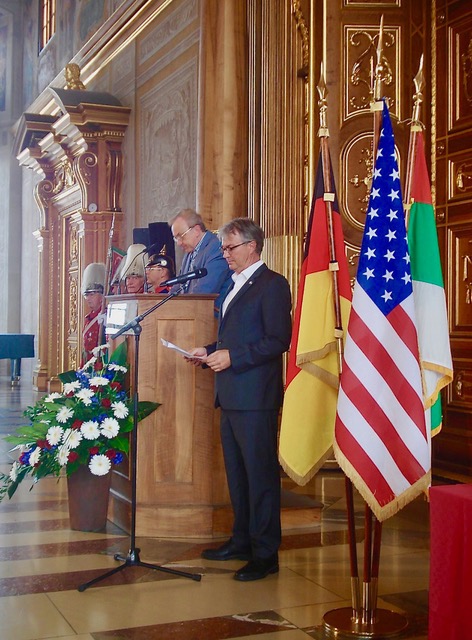 Als weiterer Sprecher trat der US-Konsul für öffentliche Angelegenheiten aus München, Stephen Ibelli, ans Rednerpult. Er vertrat die Generalkonsulin Meghan Gregonis und begrüßte seine Landsleute in einer bemerkenswerten Ansprache. Schließlich erhielt auch der Veteranenvertreter und Reunion-Organisator Vic McFadden Gelegenheit, in bewegenden Worten der Einladung zu danken und auf die persönlichen Erinnerungen und Eindrücke seiner Augsburger Dienstzeit einzugehen.
