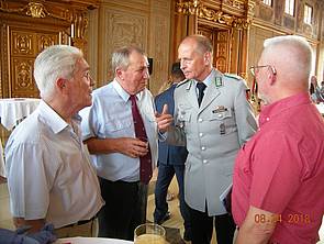 Links: Small Talk beim Umtrunk. Rechts: Ehemalige Augsburger Fallschirmjäger unterhalten sich im Beisein eines amerikanischen Gastes.