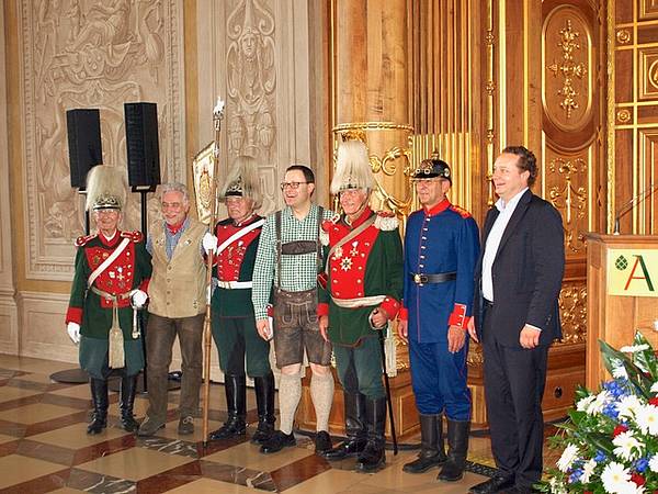 Matthias Fink vom Verein Augsburg International e.V. (Mitte, in Lederhose) mit anderen Gästen bei einem Gruppenfoto mit den königlich-bayerischen Statisten.