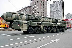 Machtdemonstration mit großen Kalibern. Die Raketen befanden sich in den Schutzhüllen auf den gigantischen Fahrzeugen und wurden alle Jahre bei den Mai-Paraden auf dem Roten Platz gezeigt. Im Bild links eine Interkontinentalrakete TOPOL M1, rechts eine SS20. Die letzte dieser Mittelstreckenraketen wurde am 12. Mai 1991 vernichtet.