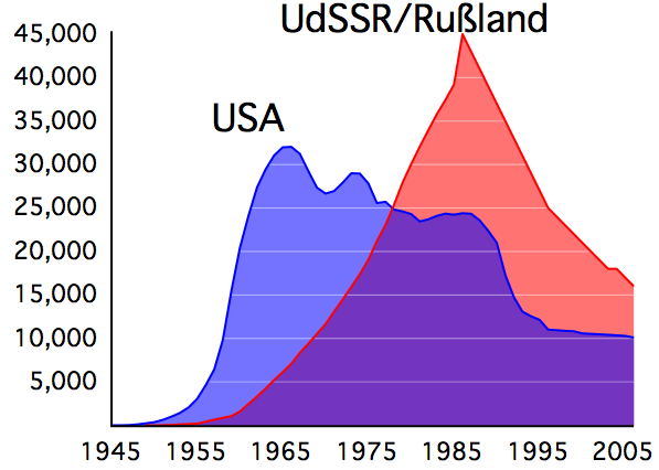 Wettrüsten: Zahl der weltweiten Atomsprengköpfe von West und Ost. (Foto: Wikipedia).
