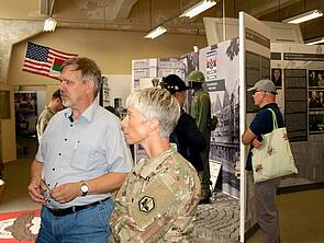 Gerhard Rankl (links) und Wolfgang Poeppel (rechts) erläutern den Gästen aus Wiesbaden die verschiedenen Ausstellungssegmente. COL Bembenek und ihre Begleiter zeigten sich sichtbar beeindruckt.