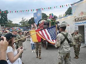 Links: Eine Abordnung der Bundeswehr-Reservisten führte den militärischen Teil des Umzugs an. Rechts: Einholen der US-Flagge vor dem Bierzelt.
