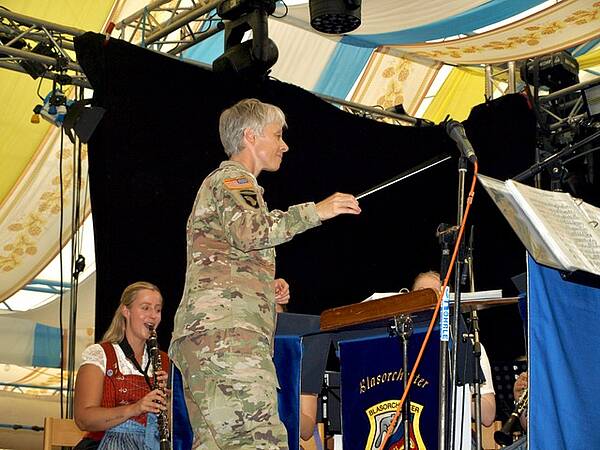 Der Bierzeltbesuch mit dem obligatorischen Hendl und einer Maß Bier wurde allerdings im späteren Verlauf von einem starken Unwetter gestört. Kurz zuvor noch dirigierte COL Bembenek ein flottes Musikstück. Beim Betreten der Musikerbühne fand ein kurzes Totengedenken mit Trompetensolo statt.