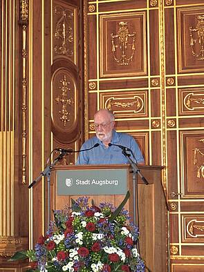 Die begrüßenden Worte mit nachdenklichen Inhalten sprachen Oberbürgermeisterin Eva Weber, Generalkonsul Tim Liston, Reunion-Organisator und MI-Veteran Mike Leary sowie Georg Feuerer von Amerika in Augsburg e.V. Leary bedankte sich bei der Stadt für die beeindruckende Einladung im Goldenen Saal und betonte, wie gerne die ehemaligen Militärangehörigen immer wieder nach Augsburg kämen. Sie empfänden es als ihre zweite Heimat, denn das Herz der Stadt ist auch ohne Kasernen das gleiche geblieben.