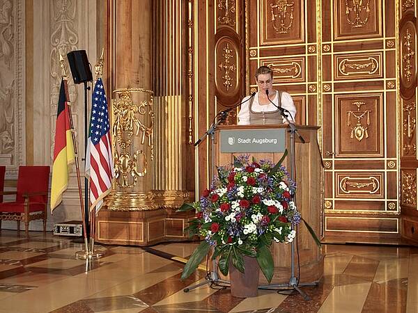On August 25, 2023 far more than 100 reunion-attendees from the USA and numerous guests of honor came together for a townhall-reception of the City of Augsburg. As suggested by the Amerika in Augsburg e.V. society, Mrs. Lord Mayor Eva Weber invited the former Field Station Augsburg military to a festive reception in the gorgeous Golden Hall. As a perfect reason, the 25th anniversary of the Augsburg U.S. base closure was the center of attention.