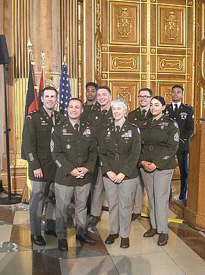 Left: Lord Mayor Weber and veteran McFadden in harmony between the USA and Augsburg. Right: COL Bembenek (front middle) with her 66th MI vanguard.