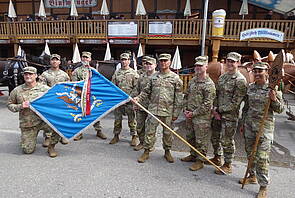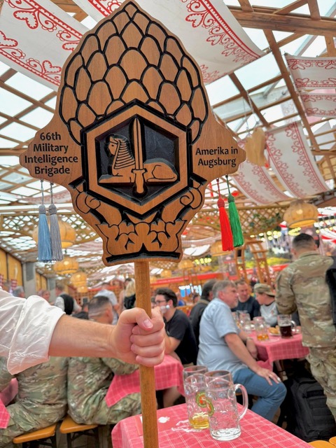 Mit den Einheits-Symbolen Dolch, Sphinx und der Augsburger Zirbelnuss: das neue Trageschild für Paraden mit der 66th Military Intelligence Brigade vom Verein Amerika in Augsburg gestaltet und angefertigt.