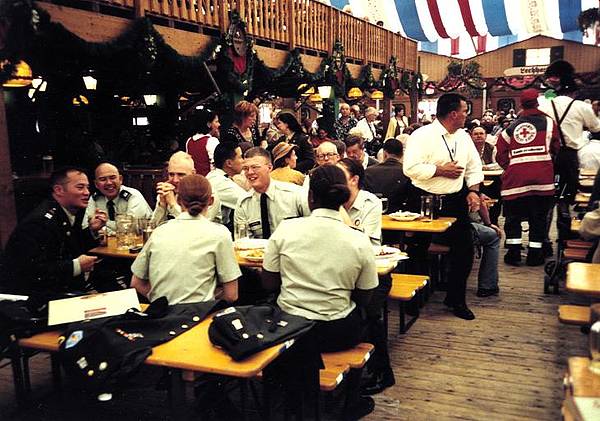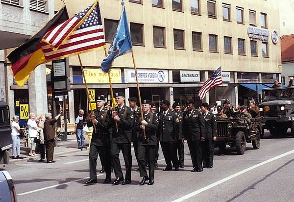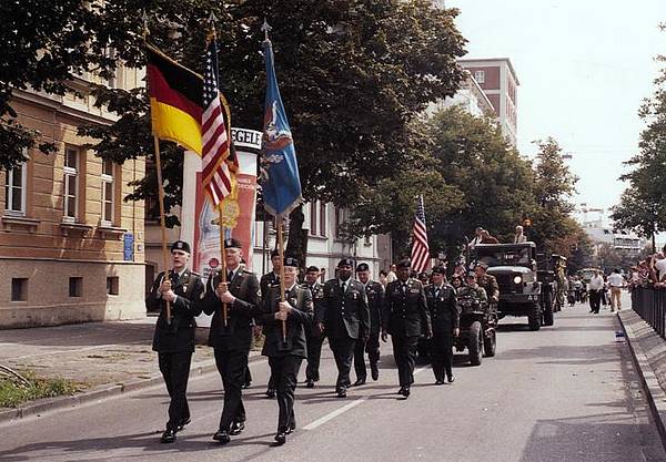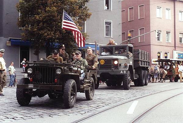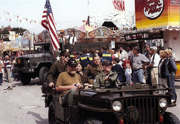 Oberbürgermeister Dr. Paul Wengert begrüßte zusammen mit 2. Bürgermeister Klaus Kirchner und Stadtrat Theo Gandenheimer die amerikanischen Gäste bei einem Umtrunk auf der Maximilianstraße, bevor sich die US-Abordnung zwischen Chevrolet-Straßenkreuzer, Willys-Jeep und Reo-Truck auf den Weg zum Plärrergelände begab. Für die Repräsentation wurden Vereinsflyer mit Lollis und Kaugummis an die Menschenreihen am Straßenrand gereicht. Die Augsburger Bevölkerung zollte den US-Soldaten bemerkenswerten Beifall, womit dem Verein ein würdigender Brückenschlag zwischen Bürgern und den unvergessenen Amerikanern gelang.